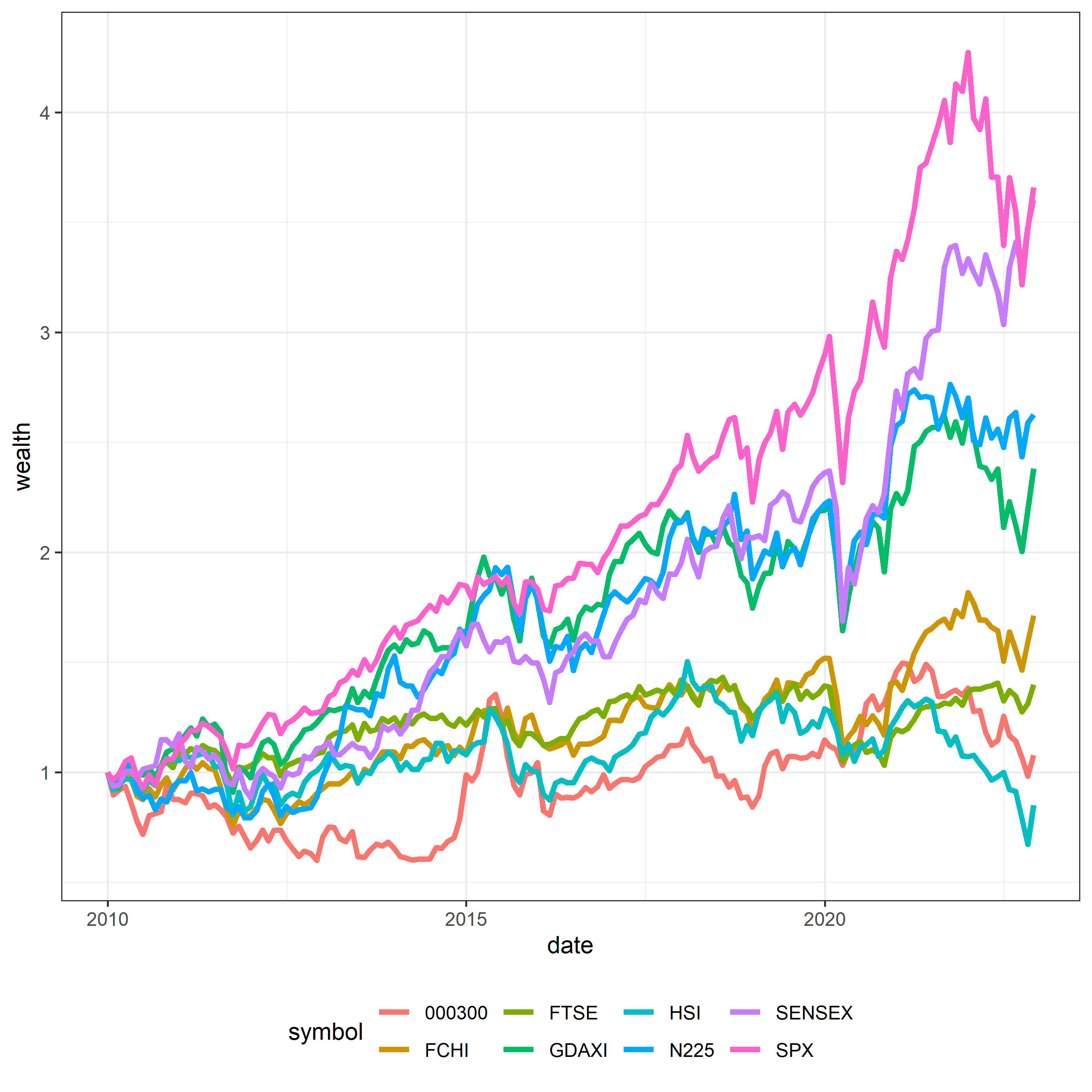 --- .pull-left[ ```r # 用 ggplot2 绘制指数增长图,从略 ... ``` <!-- --> ] -- .pull-right.code85[ ```r # 绘制相关系数矩阵图 idx_rets_w %>% select(-date) %>% cor() %>% corrplot::corrplot.mixed( upper ='ellipse', order ='hclust') ``` <img src="L12_Portfolio_files/figure-html/unnamed-chunk-24-1.png" width="85%" style="display: block; margin: auto;" /> ] --- layout: true ### >> 3.3 基准投资组合 --- .code90[ ```r # PortfolioAnalytics 对 xts 数据的接受度更高 returns <- idx_rets_w %>% timetk::tk_xts(select = -date, date_var = date) head(returns, n = 5) ``` ``` #> 000300 FCHI FTSE GDAXI HSI N225 SENSEX SPX #> 2010-01-29 -0.1039 -0.0500 -0.0414 -0.07267 -0.08003 -0.04287 -0.06338 -0.0370 #> 2010-02-26 0.0242 -0.0082 0.0320 -0.00184 0.02419 -0.00706 0.00438 0.0285 #> 2010-03-31 0.0195 0.0715 0.0607 0.09915 0.03060 0.09519 0.06684 0.0588 #> 2010-04-30 -0.0832 -0.0395 -0.0222 -0.00290 -0.00616 -0.00293 0.00177 0.0148 #> 2010-05-31 -0.0959 -0.0811 -0.0657 -0.02793 -0.06364 -0.11655 -0.03497 -0.0820 ``` ```r # compute the benchmark returns with equal weights # Naive diversification equal_weights <- rep(1 / ncol(returns), ncol(returns)) bnchmk_rets <- returns %>% Return.portfolio( # PerformanceAnalytics weights = equal_weights, rebalance_on = "quarters" ) colnames(bnchmk_rets) <- "benchmark" # default: "portfolio.returns" ``` ] --- .code75[ ```r # Benchmark performance table.AnnualizedReturns(cbind(bnchmk_rets, returns)) # PerformanceAnalytics ``` ``` #> benchmark X000300 FCHI FTSE GDAXI HSI N225 SENSEX SPX #> Annualized Return 0.0577 0.0058 0.0425 0.0263 0.0694 -0.0125 0.0776 0.104 0.106 #> Annualized Std Dev 0.1336 0.2276 0.1686 0.1278 0.1791 0.1967 0.1751 0.170 0.150 #> Annualized Sharpe (Rf=0%) 0.4322 0.0255 0.2521 0.2061 0.3878 -0.0634 0.4432 0.612 0.703 ``` ] -- .code75[ ```r library(dygraphs) cumprod(1 + cbind(bnchmk_rets, returns)) %>% dygraph(width = 1000, height = 300) %>% dyRangeSelector() ```